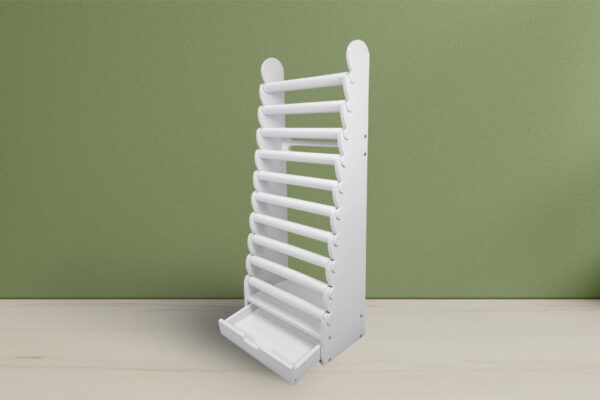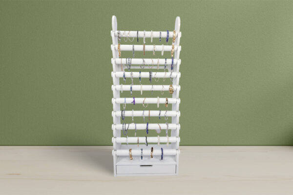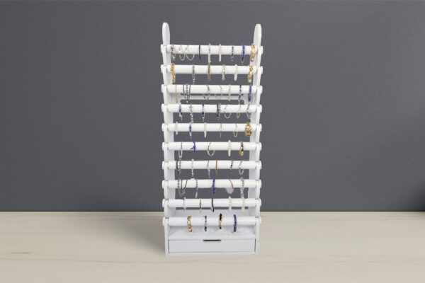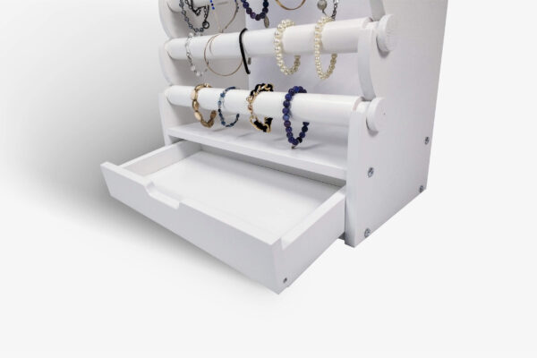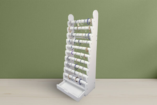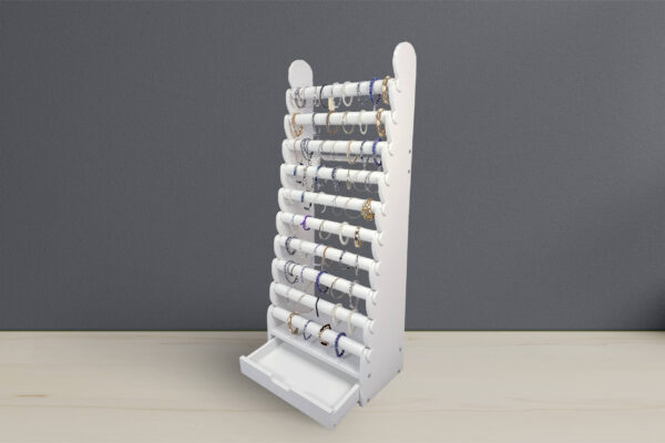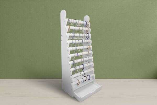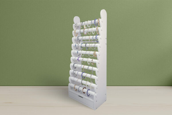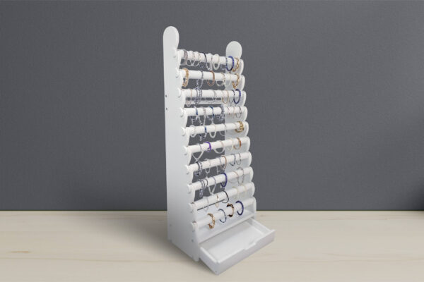 Our giant bracelet and bangles display holder stands taller then it’s competition and has a built-in drawer that serves as a storage unit where you can store bags, business cards, jewelry display additional inventory for refills, receipt books, pens, or anything else that you might need. Think of it as an add-on element that you can use for various purposes. It is ideal for retail or home use.