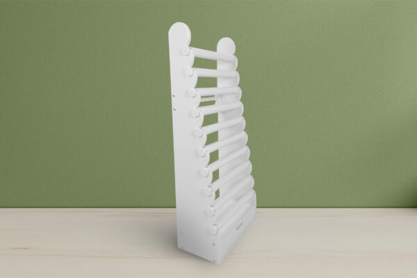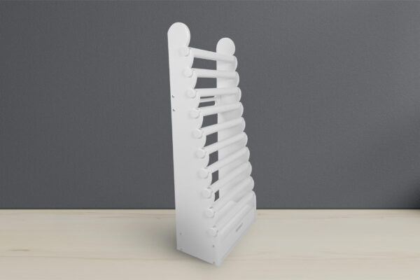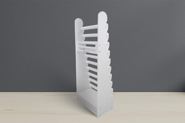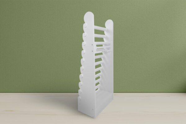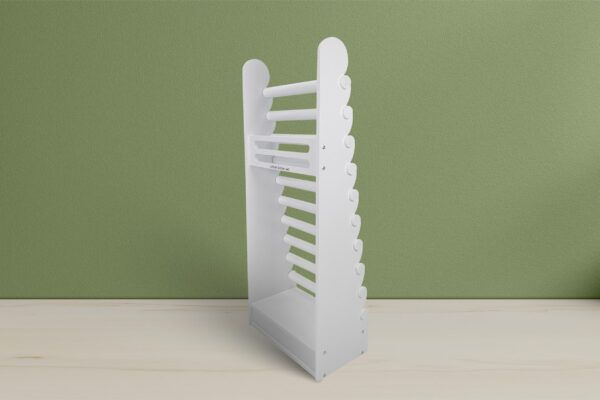 Our 10 tier bracelet holder stand features ten 18-inch wooden bars that offer a convenient display where each bar can each hold up to 70 bracelets at one time. It is also ideal for storage of bangles. With its stand-out vertical design, this jewelry stand is ideal for any retail or vending opportunities where counter space needs to be maximized.